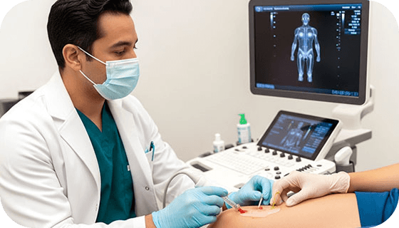 Aplicación precisa del PRP en sitio de lesión bajo guía ecográfica en tiempo real.